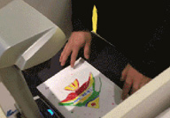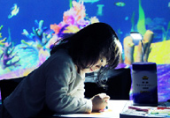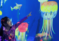小朋友们画的鱼会游到墙面的海底世界里,鱼儿还会说话,并且游来游去的鱼可以在微信朋友圈里分享。